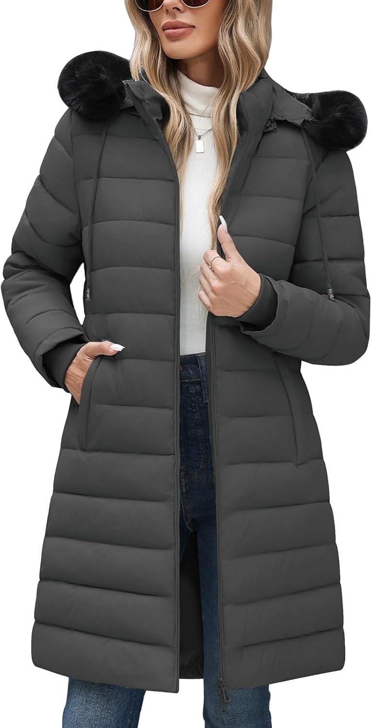 • Design: This ladies long winter coat boasts a stylish slim-fit that hugs your waist, so you still look stunning even when you’re bundled up! The detachable hood includes a black faux fur trim and an adjustable Velcro strap for a customizable fit, trim gives additional warmth and protection for your head, neck, and ears. This versatile and comfortable long puffer coat women is puffy and soft, adding an extra touch of elegance to your overall look